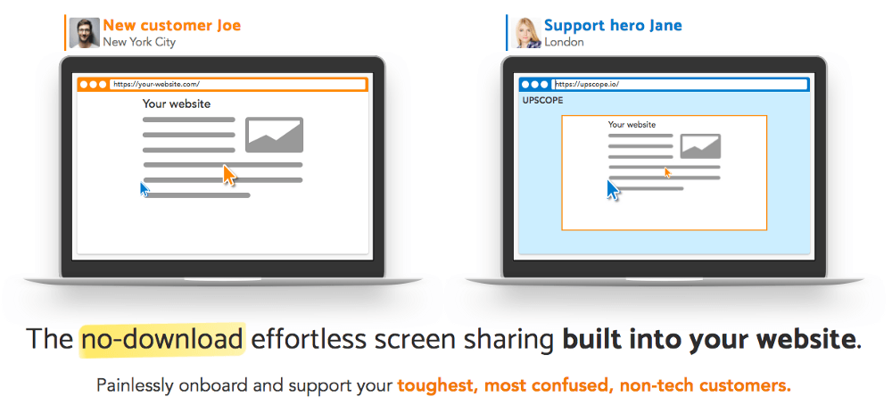 Onboard your toughest non-tech customer using Upscope co-browsing. As you talk to them, draw circles around features on THEIR screen as they sit back and learn.