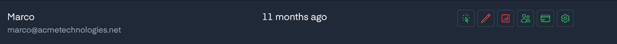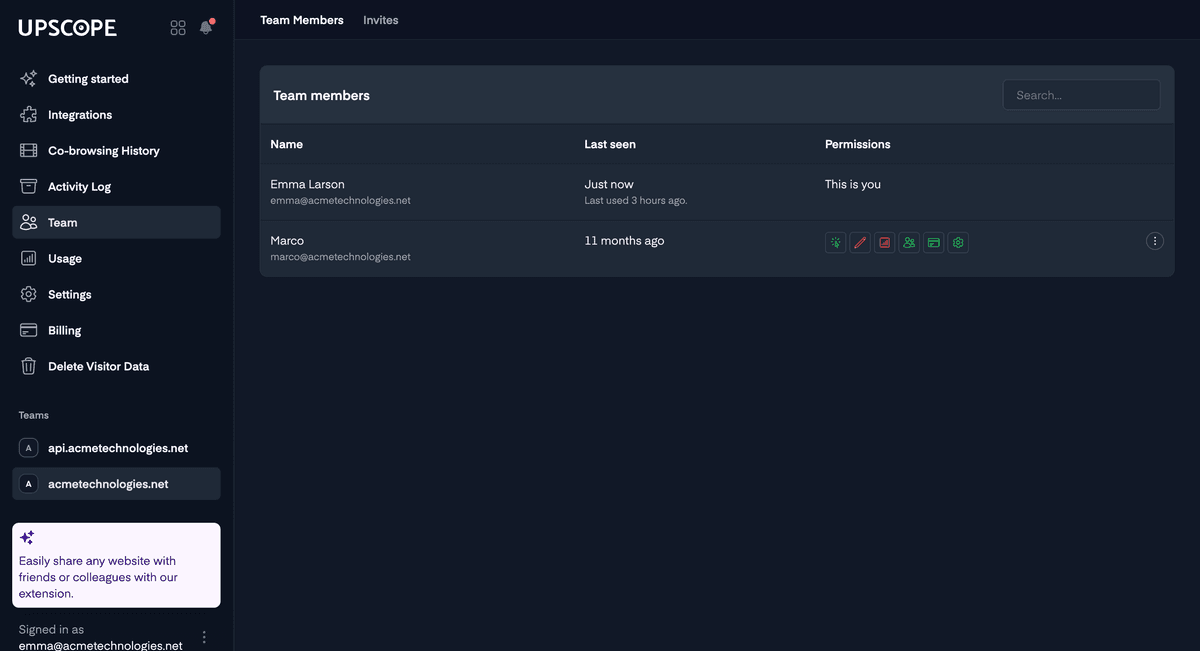 To do this, go to Team on the left-hand menu. Beside each team member, there are 8 icons indicating the types of permissions. To activate or deactivate each one, simply click on it to turn it green or red.